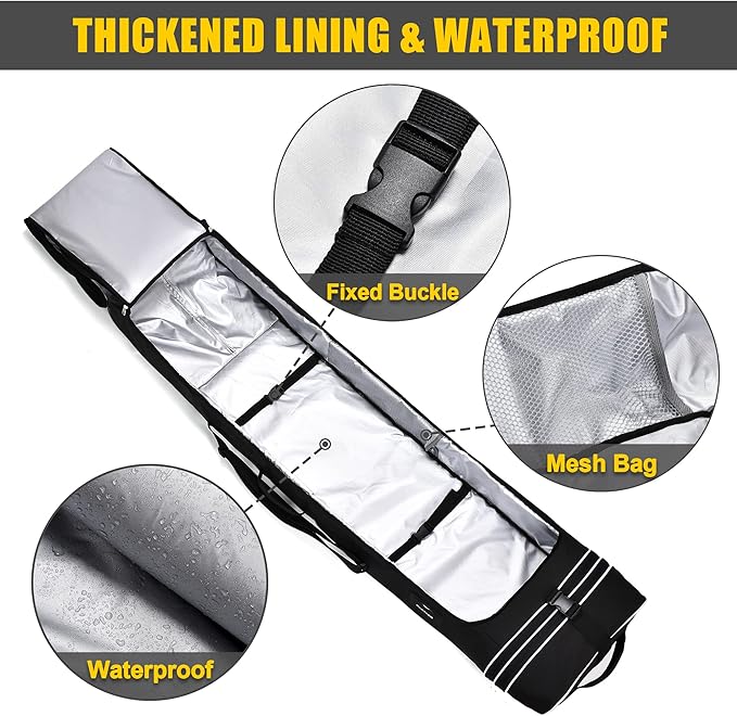 - ✨PREMIUM MATERIAL:Snowboard bag made of 600D heavy-duty oxford fabric,0.63"sponge layer and water resistant coating layer constitute, durable, thickened,waterproof,wear-resistant.Snowboard bag with wheels interior is fully surrounded by 210D water resistant lining,ensure the safety of the snowboards during transport.