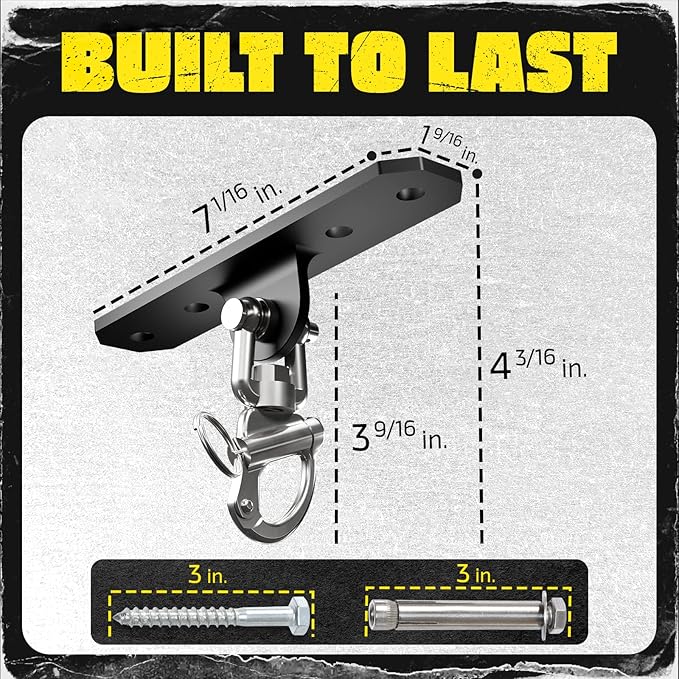 - 1-YEAR WARRANTY, 30-DAY RETURN: The punching bag hanger comes with a 1-year warranty and a 30-day return policy; You can contact us if you have any problems with our punching bag ceiling mount; Our top priority is the high quality of our swing hangers heavy duty "