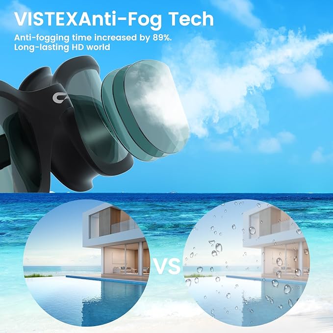 - 【VISTEX ANTI-FOG TECHNOLOGY FOR SWIMMING GOGGLES HD】Our adult swim goggles feature industry-leading VISTEX anti-fog technology, which far exceeds the anti-fog performance of traditional swim goggles with an innovative coating that extends anti-fog time by 89%. Not only does it effectively stop water vapor condensation, but it also maintains its performance after multiple uses, ensuring a clear, fog-free view during every swim