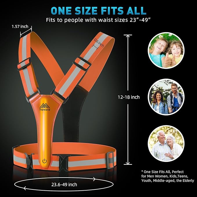 - COMFORTABLE & ELASTIC & ADJUSTABLE - The ergonomic design of this LED reflective vest ensures your comfort when you wear it over any dress typically t-shirt, sports gear, jacket as per the season. Waist circumference expands from 23" to 49"; Shoulder strap: 12 - 26 inch; perfect gift for men/women/kids/teens/the elderly