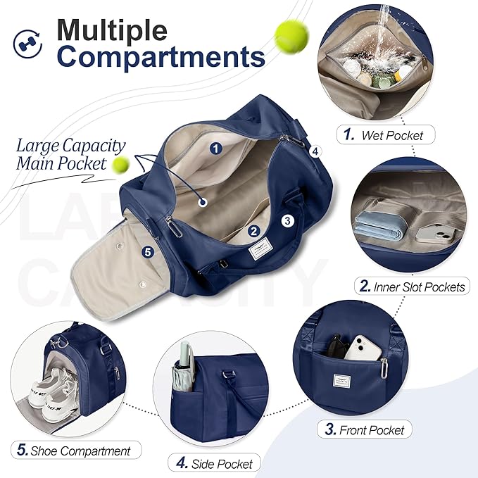 FIORETTO Womens Gym Tote Duffle Bag with Wet Pocket & Shoe Compartment, Sports Duffel Overnight Weekender Hospital Workout Carry on Bag for Girls, Ideal for Travel, Swimming, Dance, Ballet Navy Blue