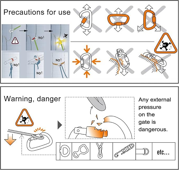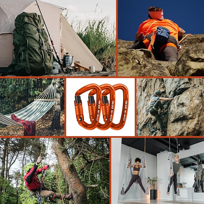 - 【Wide range of uses】This climbing carabiner has a weight limit at 25kN (5620 lbs) for major axis, 7kN cross force, and 7kN from end to end while the gate is open.These aircraft grade aluminum climbing carabiners are great for all activities like rock climbing, ice climbing, rappelling, rescue, swing, aerial yoga, camping and hiking etc.