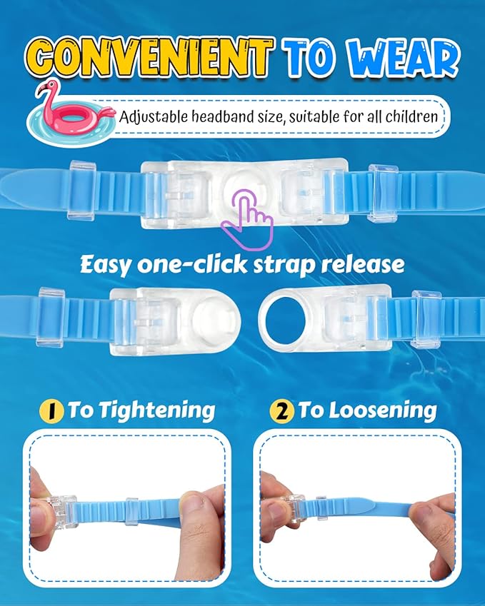 - 【PANORAMIC VIEW & EASY TO WEAR】 Our kids' goggles provide a mask-like fit, carefully designed to accommodate children's faces and ensure a comfortable and secure seal. This not only offers a beautiful and stylish appearance but also expands your child's underwater vision with a panoramic viewWith a convenient button-release design, these goggles are incredibly easy for kids to put on and take off by themselves, promoting independence and a hassle-free swimming experience.