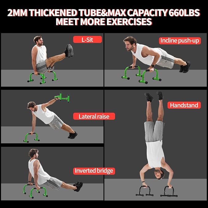 - 🤝【Perfect Size】 The parallettes size L:17in* W:8.3in *H:9.5in, 1.5in diameter, 0.079in (2mm) tube thickness. Commercial thickness can fully support 660LBS. Extended handle and perfect height provide the right space great for you to do dips, pushups, V-sits, L-sits, tuck, planche, handstand push ups, ab workouts , stretches and many more bodyweight strength training.