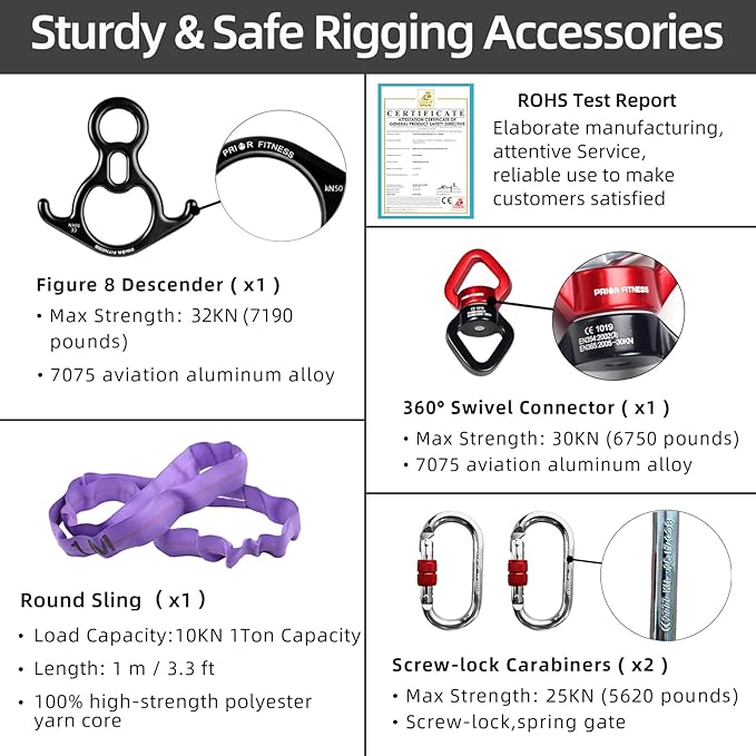 - 【Safety Tested & Guarantee】Aerial Silk is CE certified, SGS tested and recommended by certified aerial yoga teachers, Figure 8 Descender rated up to 32KN (7190pounds), 360°Swivel Connector (EN Certified) rated up to 30KN(6750 pounds), Daisy Chain Straps rated up to 10KN(2248 pounds),Screw-lock Carabiners (CE & EN Certified) rated up to 25KN(5620 pounds)