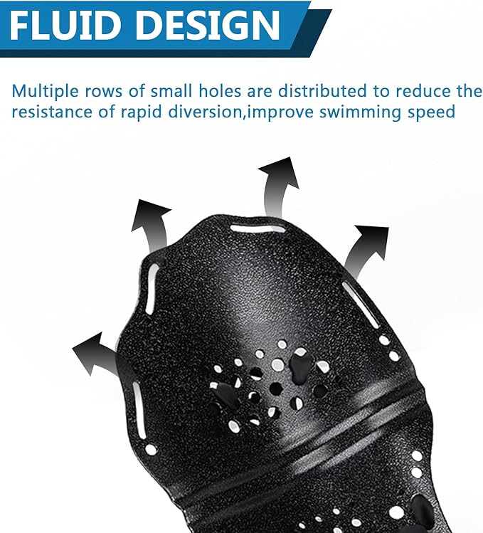 - [EXTREMELY COMFORTABLE] The hand paddles are made of high quality PC material, light weight, not easy to bend, with many drainage holes and waterways, the smooth design can push more water and create a smooth pulling trajectory, reduce shoulder burden and fatigue, let you have a better feeling of the water.