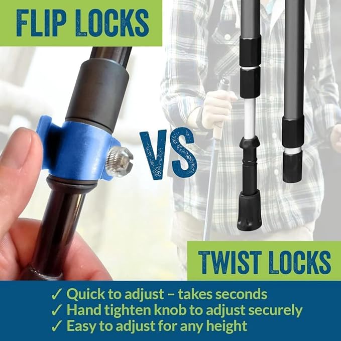 - ADJUSTABLE & ERGONOMIC: Poles adjust from 32"-54" using a new and exclusive flip lock mechanism (better than twist locks or jarring button locks), assisting with active walkers, hikers and physical therapy. Adjusts to any height from children and adults up to 6'2 with a max weight support of 230 lbs. Perfect for seniors you can go poling on beaches, trails, woods, or urban streets