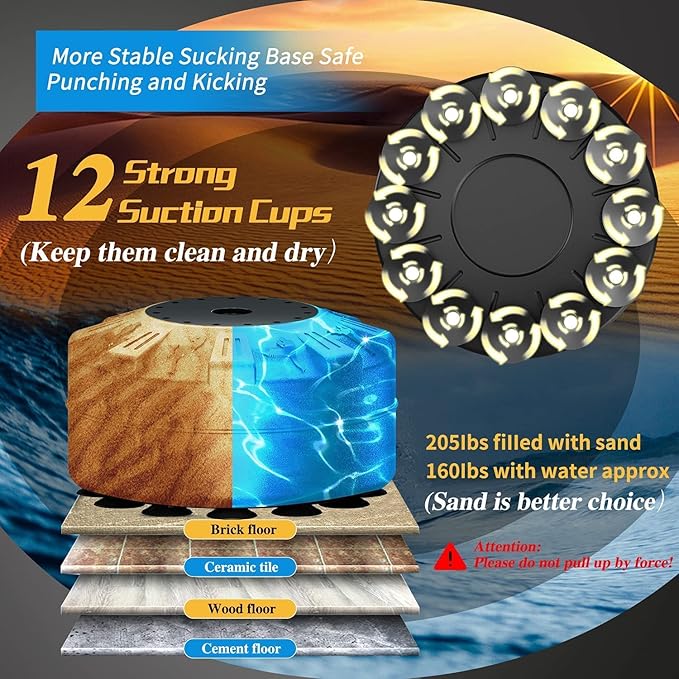 - 【Super Solid Base with Suction Cups】 Featuring a round base with a diameter of 19.7 inches, thisBolsa de boxeo para adultos with stand provides easy roll relocation. The base is securely held in place by 12 strong suction cups, ensuring stability during intense training sessions. When filled with sand, the punching bag with a stand weighs up to 205 pounds for maximum durability. It stands at approximately 70 inches (176cm) tall.