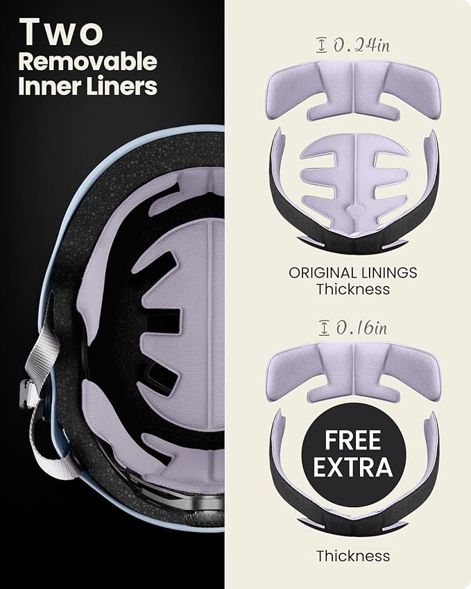 - Extra Removable Lining: Skateboard helmet with two removable liner for different head sizes and easy to wash the sweat away