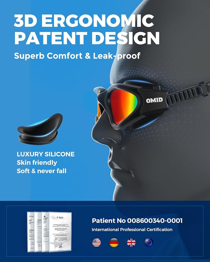 - 【Professional Leak-proof & UV Protection】Our swimming goggles for men designed with Ergonomic 3D frame ensures a perfect fit and never allows water leak in. In order to protect your eyes from irritation. OMID swim goggles are constructed with 111% UV protection to filter out harmful rays, which will bring you worry-free, crystal clear swims every time.