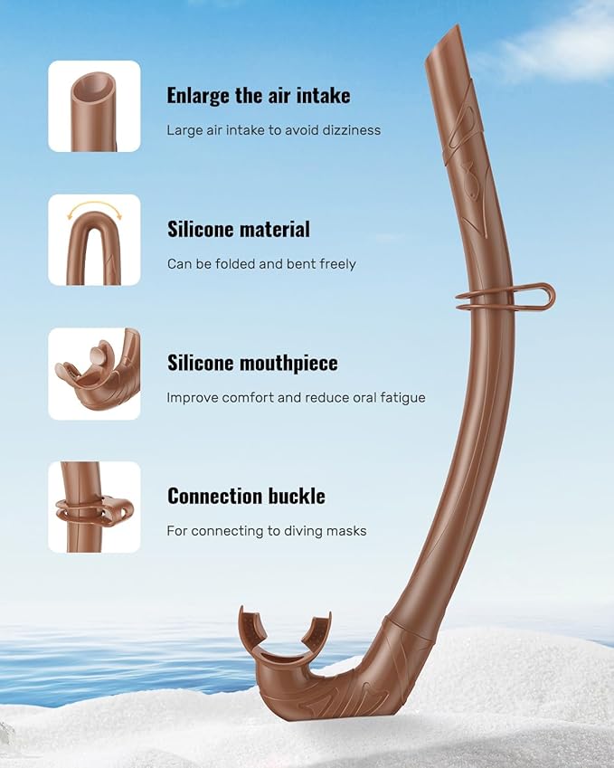 - 【Large Diameter Snorkel Tube】The large diameter breathing tube provides us with sufficient and smooth fresh air.When we swim or snorkel underwater, there is no need to worry about insufficient breathing. It can provide you with a safe and comfortable downstream gaming experience.