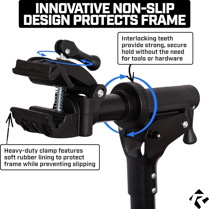 - Highly Adjustable for Any Repair - Telescoping center pole adjusts up to 30” so you can raise or lower your bike to just the right height. The bike clamp and clamp arm both rotate a full 360 degrees to clamp to your top, bottom, or seat tube and hold your bike at any angle. And an adjustable handlebar rod stabilizes your front wheel while you work. Clamp fits standard frames with 1" to 1.5" tubing.