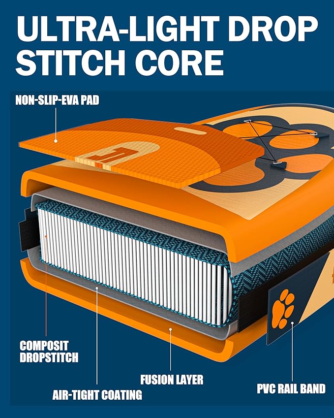- 【Anti-slip & Anti-scratch Pad】Non-slip EVA deck pad of the inflatable paddle board is covered at the forth end,makes sure your dog doesn't go sliding off when you hit a wave.The important feature is anti-scratch pad for dog, making a dog stay on the front of the paddle.