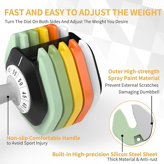 - 【Home Fitness Necessity】SKOK adjustable dumbbell supports diverse strength training by changing different weights. Adjustment weights from 10lb to 55lb, even fitness beginners are very easy to use. It is a great choice for modify muscle lines and strong muscle fibers.