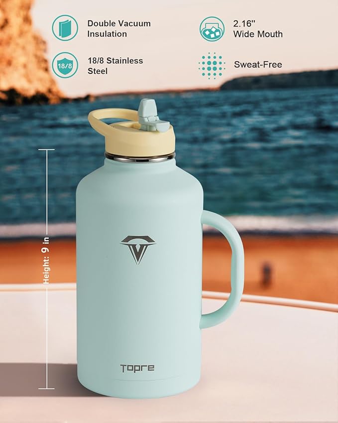 - Easy-Grip & Sturdy Handle: Topre half gallon water bottle features an ergonomic hollow design on its handle, ensuring comfortable grip and easy lifting. Perfect for effortless single-handed use while on the go. Quench your thirst with its generous 64 ounce large capacity –prompt hydration at your fingertips.