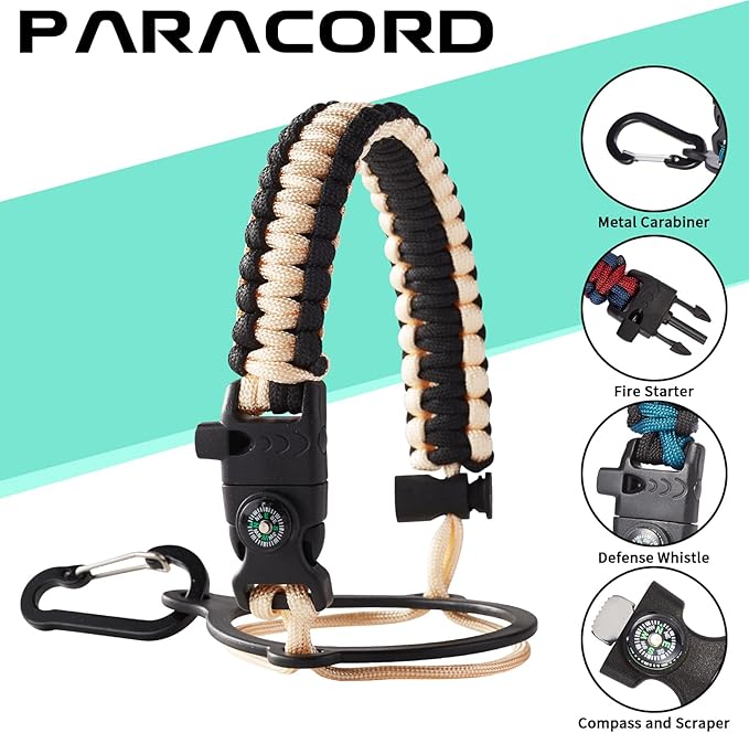 - UNIQUE PARACORD—Perfect Accessories: bright color paracord matches the flask water bottle to give you a youthful vibe while adding a personal style. It comes with a compass, safety loop, metal carabiner, flint, igniter, and whistle to become your survival tool for your wild adventures