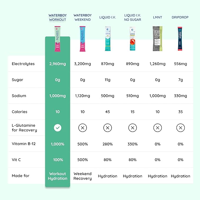 - Product Benefits : Waterboy Workout Hydration | 2,960mg Sugar Free Electrolyte Powder Packets | L-Glutamine + Vitamins | No Sugar, All Natural, Gluten Free | 15 Drink Stick Mixes (Blue Raspberry) Waterboy Workout Hydration | 2,960mg Sugar Free Electrolyte Powder Packets | L-Glutamine + Vitamins | No Sugar, All Natural, Gluten Free | 15 Drink Stick Mix… See more