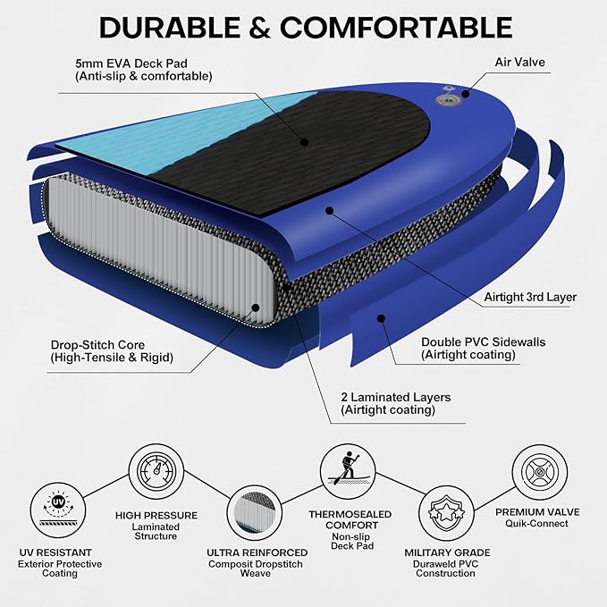 - Premium Military-Grade Construction: The inflatable SUP made of drop-stitch core and double PVC material for exceptional rigidity and puncture resistance, resists deformation under 350 lbs load. UV-resistant & thermosealed layers ensure long-lasting durability for ocean, lake, and river adventures.
