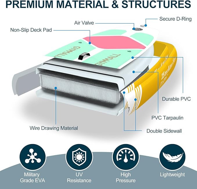 - [Premium Material] Our inflatable paddle boards for adults are made from quality military grade PVC material for durability and longevity. They feature a dual-layer PVC construction that combines light weight with strength, providing increased stiffness for superior performance on the water. Whether you’re navigating calm waters or tackling rough currents, our paddle boards deliver superior performance.