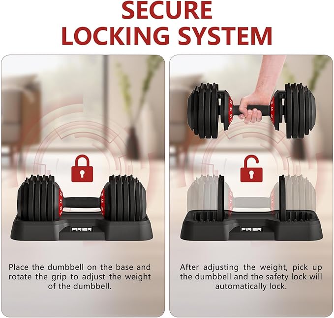 - 【Secure Dual-Locking System】The PIRIER adjustable dumbbell is equipped with a distinctive dual safety locking mechanism. The dumbbell plates are securely attached to the handle via eight locking slots, providing enhanced safety and stability during use