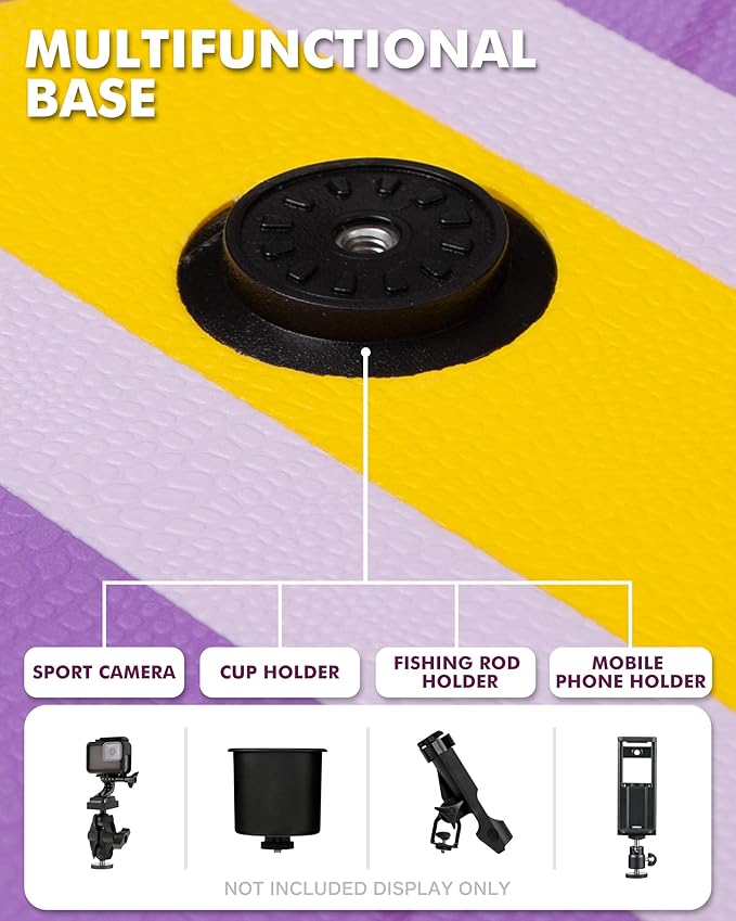 - 【Multifunctional base】The paddleboard multifunctional base can meet various needs. When you are traveling, you can install a cup holder so that you can replenish water anytime and anywhere without stopping, sitting down, opening your package, and so on. When you go out fishing, you can install a fishing rod bracket, place your fishing rod, or place your fish detector. When you want to record your wonderful moments of playing, you can install your sports camera or your phone holder, etc.
