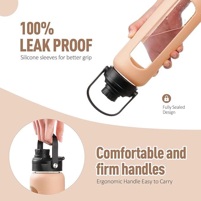 - WHAT YOU'LL GET - Our daily water intake bottle set comes with a water bottle covered with a silicone protective sleeve, 1 bamboo lid plus 1 spout lid with handle, 2 straws(1 stainless steel and 1 tritan), and 1 straw cleaning brush. You can switch between the two lids according to the occasion and preferences. If there is any problem with your water bottle glass or the lid is damaged within 6 months, you can contact us at any time for a replacement.