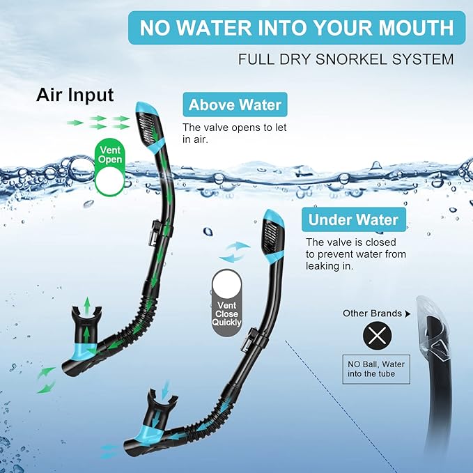 - Anti-Fog & Anti-Leak: The dry snorkel has a closing valve which seals the tube automatically as you dive while it allows air to easily enter snorkel for relaxed and unobstructed breathing when on water surface. It will keep water out when you dive under the water surface.