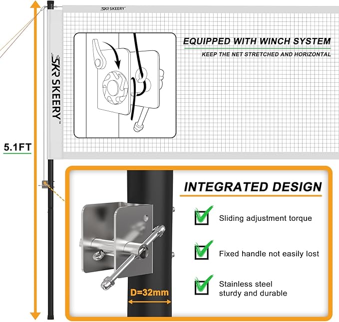 - 𝙉𝙚𝙬𝙡𝙮 𝙪𝙥𝙜𝙧𝙖𝙙𝙚𝙙 𝙞𝙣𝙩𝙚𝙜𝙧𝙖𝙩𝙚𝙙 𝙬𝙞𝙣𝙘𝙝 𝙨𝙮𝙨𝙩𝙚𝙢:Badminton net is equipped with a winch system, combined with a high strength nylon rope on the top of the net, which can better keep the net pulled tight and horizontal, made of stainless steel, with sliding adjustable torque and fixed handle, which is not easy to be lost and more convenient to use;