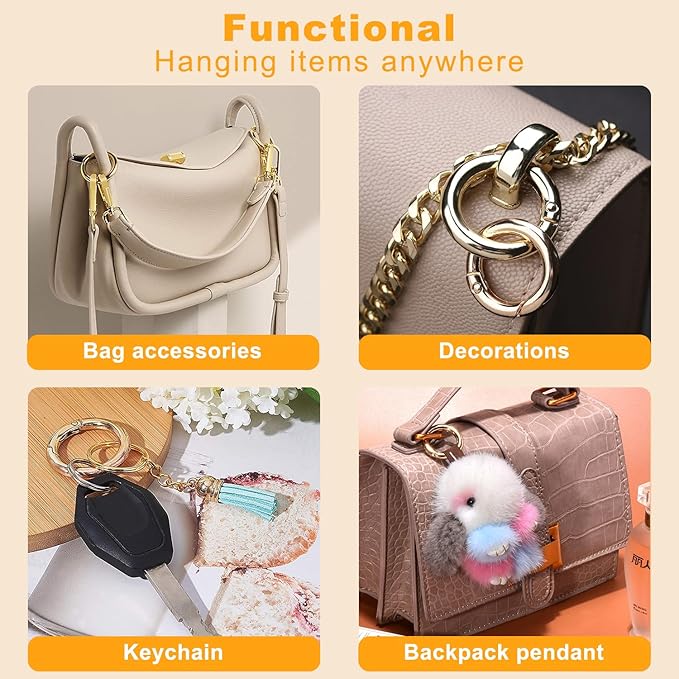 - Spring Opening Design: Spring o-ring with open design, easy to use, just open the spring-loaded gate and clip it to items quickly. The clips stay shut on their own for convenient one-handed use. Round carabiner clip can be used to hang keychains, wallet hardware, umbrella cord lanyards