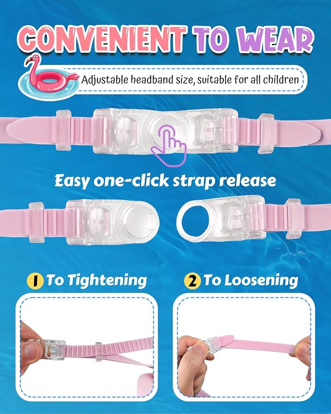 - 【PANORAMIC VIEW & EASY TO WEAR】 Our kids' goggles provide a mask-like fit, carefully designed to accommodate children's faces and ensure a comfortable and secure seal. This not only offers a beautiful and stylish appearance but also expands your child's underwater vision with a panoramic viewWith a convenient button-release design, these goggles are incredibly easy for kids to put on and take off by themselves, promoting independence and a hassle-free swimming experience.
