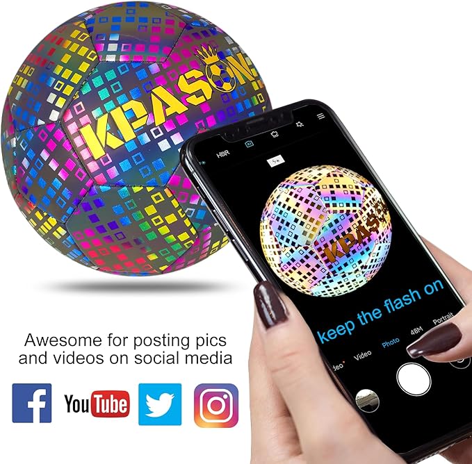 - ⚽SPECTACULAR HOLOGRAPHIC REFLECTIVE SOCCER BALL -- When light shines on the ball, new generation reflective PU leather provides the soccer ball with a shiny, holographic reflective glowing surface, captivating soccer fans and adults. Photos or videos with your flash-on camera will get the perfect holographic effect