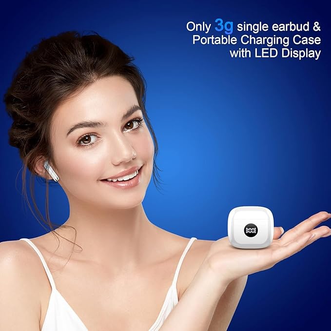 - Small size, big possibilities: 3g single earbud, pocket design charging case with LED power display, and 40H playtime: The wireless ear buds feature a portable design and an improved LED display that shows the remaining battery of each head phones and charging case in real-time. And on a full charge of 1H, your earbuds wireless Bluetooth will last up to 8H, plus the fully charged case can provide about 4 recharges for it. Enjoy vibrant sound anytime, anywhere. Perfect for indoor or outdoor.