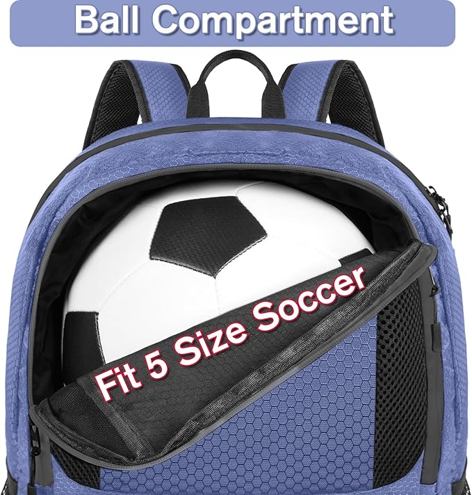 - SEPARATE COMPARTMENT: The ball compartment at the top of the soccer bag can hold soccer balls, basketball, volleyball and football, up to size 7. If you are interested in multiple sports, this sports bag can definitely meet your needs in various scenarios. And another separate pocket at the bottom can carry size 10 shoes. 2 metal breathable holes in the compartment keep your soccer cleat dry at all times