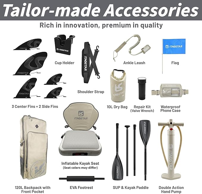 - Tailored One-Stop Accessories - Our iSUP set features more stuff than others, which include an adjustable paddle with kayak kit, 5 fins, seat, footrest, double-action pump, shoulder strap, ankle leash, waterproof pouch, 120L backpack, 10L dry bag, cup holder, flag, whistle, valve wrench, and manual