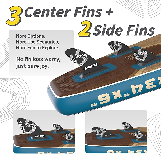 - More Fun - Exclusively from iTAOSTAR, our five tailored fins (3 central + 2 side fins) adapt to various scenrios, offering diverse balance and zero fin-loss worries. Dive into personalized paddleboarding fun without limits