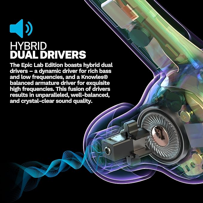 - 🎶 HYBRID DUAL DRIVERS: The Epic Lab Edition boasts hybrid dual drivers – a dynamic driver for rich bass and low frequencies, and a Knowles balanced armature driver for exquisite high frequencies. This fusion of drivers results in unparalleled, well-balanced, and crystal-clear sound quality. Here’s how Knowles created a balanced armature driver tuned for higher frequencies.