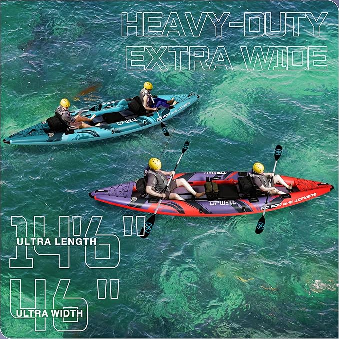 - PROFESSIONAL 2+1 DESIGN:The inflatable recreational kayak from UPWELL, it's 14'6" long x 46" wide x 12" height, weighs 40 lbs. The weight capacity up to around 700 lbs, making it lightweight for portability and especially suited for two or more who needs a tandem. The inflatable kayak is designed for all skill levels to explore in different areas for traveling and touring