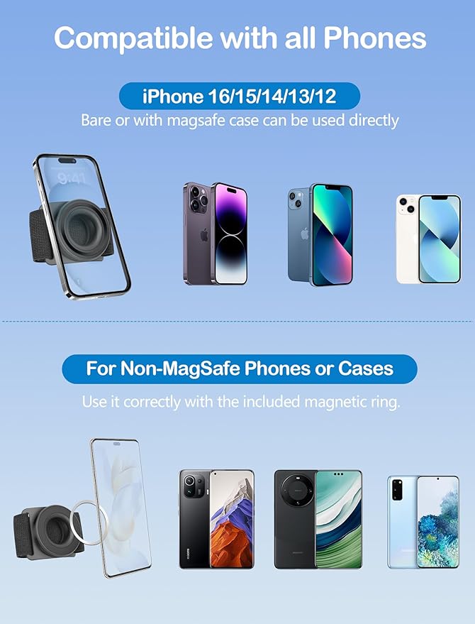 - ⚠️ Note: iPhone 16/15/14/13/12 Pro/Mini with MagSafe or MagSafe-compatible cases can be used directly. For phones or cases without MagSafe, use in conjunction with the supplied magnetic loop, peel off the 3M adhesive of the magnetic ring and stick it firmly to your phone or case. Stability may be affected for oversized or heavier phones (e.g. iPhone 16 Pro Max).