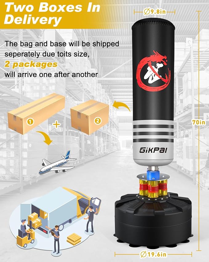 - Complete Boxing Equipment Set: The package includes a free standing punching bag and a pair of high-quality 12oz boxing gloves. Base and bag ship separately due to size. Pls reach us if only one arrives.