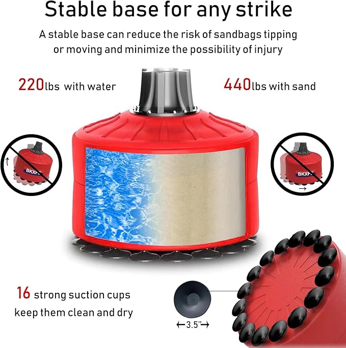 - Its approximately 24-inch base has 16 powerful suction cups that can firmly fix the sandbag on a flat ground. After filling with water, the base weighs 210 pounds. After filling with sand, the base weighs 270 pounds, which can ensure maximum stability during training.