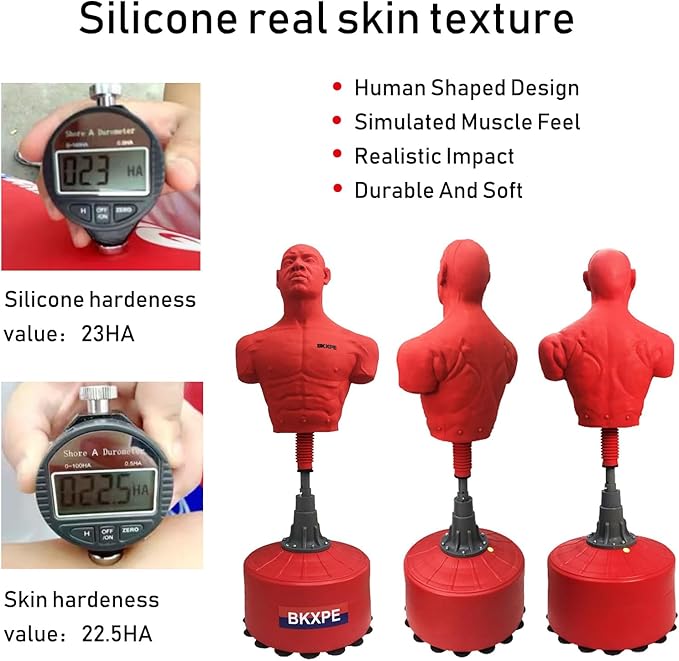 - This human-shaped sandbag has a human facial features and body shape. It is made of silicone material and filled with high-elastic fiber fabric, which has excellent impact resistance. Even after long-term punching, it will not deform. Its surface is close to the hardness of human skin, bringing a more realistic feel.