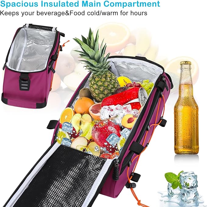 - This bike rack bag is made of waterproof and durable polyester material, effectively prevent rain/water/mud/dust from entering this bag quickly. Insulated inner lining can keep your drink and food cold or warm for hours. And it also can be used to store some fresh fruits, snacks or beverages.