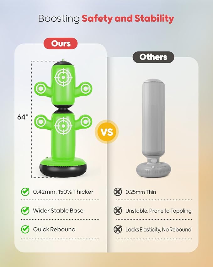 - Enhanced Stability: Thickened 0.42mm premium PVC prevents kids punching dummy from air leaks and tears. Enlarged and widened base ensures greater stability, preventing tipping. Fast rebounds quickly for increased flexibility, capable of withstanding vigorous play and training activities.