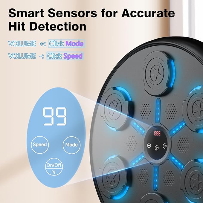 - Smart Tracking and Personalized Workouts: The Music Boxing Machine offers 9 speeds and 9 punching modes, controlled via a smart touch screen. Each punch triggers an LED light, showing your score and accuracy. It tracks every punch and provides real-time feedback. Plus, you can connect via Bluetooth to choose your favorite music rhythm for a more engaging workout experience
