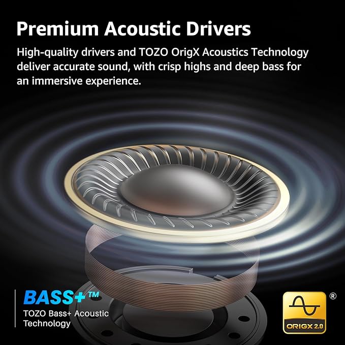 - [Immersive Stereo Sound] TOZO Crystal Pods have oversized 10mm drivers and an exclusive OrigX Acoustic 2.0 sound technology that deliver powerful bass and delicate treble, bringing you into an immersive musical feast.