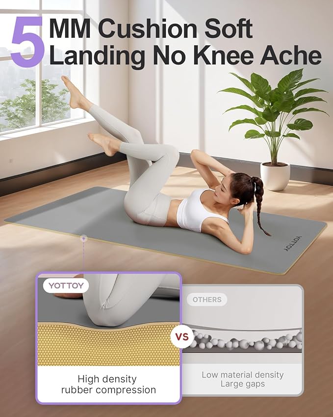 - 1.Innovative Upgraded Yoga Mat: Our YOTTOY PU Yoga Mat features a unique coconut shell material offering superior anti-slip performance. Measuring 72" x 26" x 5mm, it provides enhanced elasticity, durability, and tear resistance, making it the perfect choice for intense yoga sessions. The high-density surface ensures excellent rebound, providing a better grip and stability for your practice.