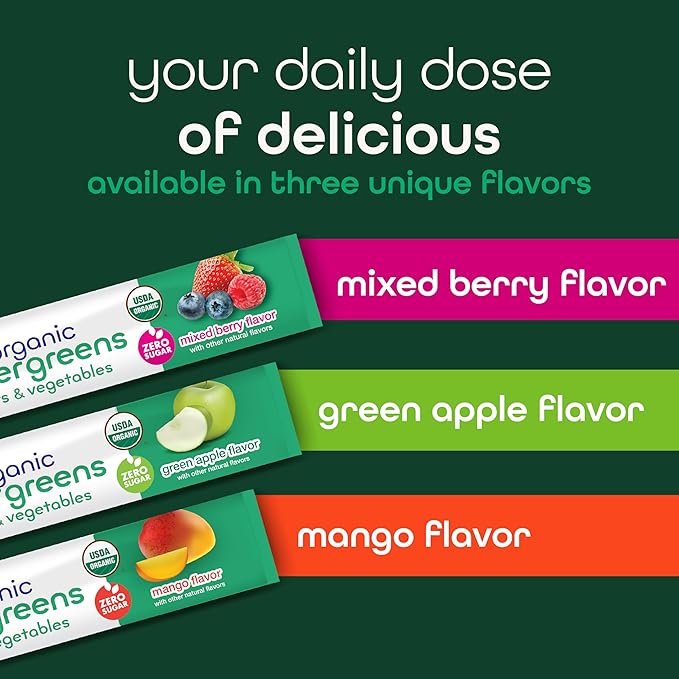 - Green Goodness On the Go: Our organic super green supplement comes in easy-to-tear stick packs so you can enjoy your daily greens supplement wherever you go. Bring the packs in your backpack, gym bag, purse, or even in a pocket