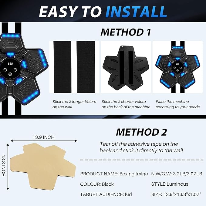 - Easy to Install : Our music boxing machine is easy to setup and use and doesn't take up a lot of space. It's wall-mounted without drilling holes in the wall, use double sided tape or velcro to attach the boxing machine to the wall adjust to preferred height. The machine has a compact design that fits perfectly in home.