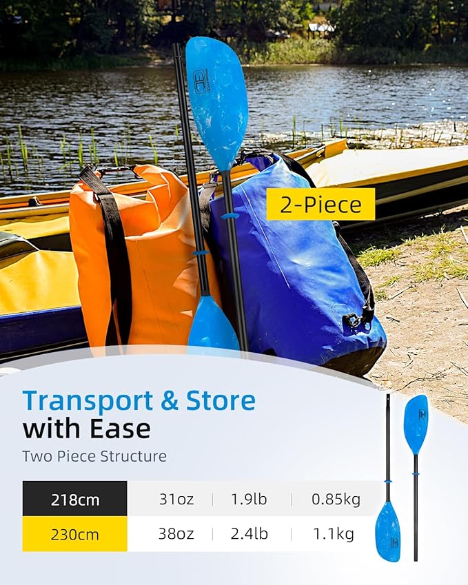 • 【Portable & Lightweight】The kayak paddle shaft is detachable at 2 sections, for easy carrying and space-saving storage.It's your ideal travel buddy for every outdoor expedition!