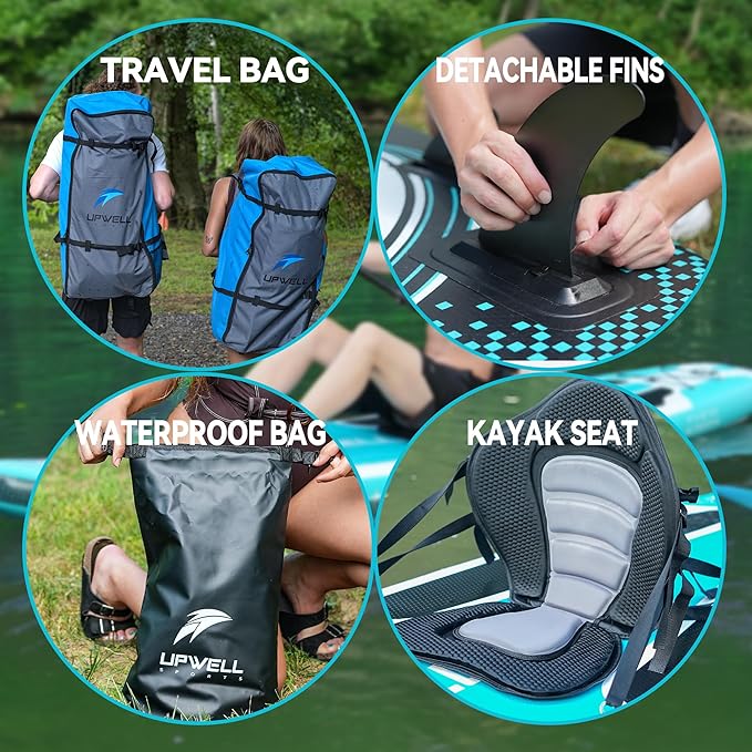 - FULL SET OF ACCESSORIES:Purchase one you will get all gears you need: 1x inflatable stand up paddle board, 3x removable fins, 1x adjustable-length Aluminum alloy paddle, 1x coiled ankle leash, 1x hand pump for quick inflation and deflation, 1x 10L waterproof storage bag for your essentials, 1x roomy backpack, 1x emergency repair kit, 1x waterproof phone bag, 1x SUP kayak seat has combined polyurethane foam waterproof cushion and the best mid-sized seat back on the market